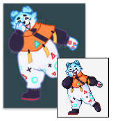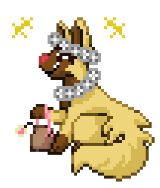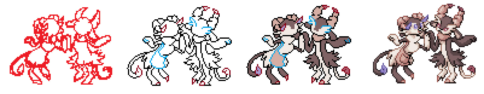How does the sprite making process work?>If im working off of a pose im making, i sketch it out on paper before i hop into Aseprite to begin the process! I start with a red line sketch, adding in extra colors to the sketch if i need extra details. Then i go in and line it in black. If other features need to be a different color, sometimes ill use a different outlining color. After that i place all the colors down to the best of my ability. The final step ends up being a myriad of steps that kind just blend together for me. Like adding the shading, coloring the lines and cleaning up spots that dont look right to me.